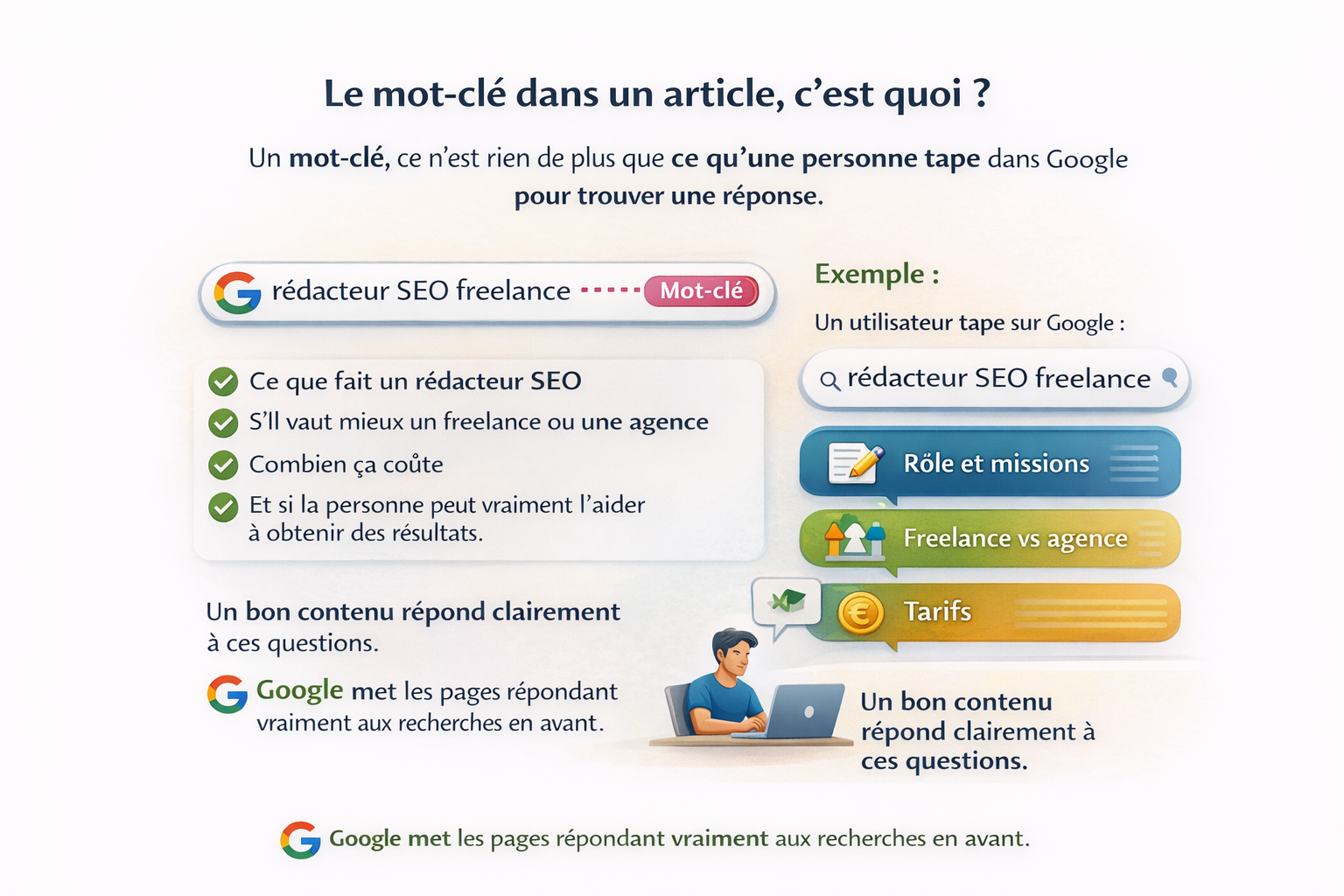 Un bon contenu ne se contente donc pas de répéter « rédacteur SEO freelance ».